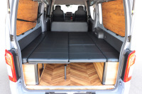 製作したトランスポーターのベッドは、使い方に合わせて自由に展開することができるSHシングルフリップベッドを取付けました。