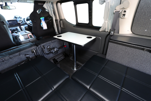 全面をベッドとして使った時と、セカンドシートはそのままで荷室でテーブルが使えるようになっています。