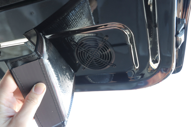 バックドアにファンがあることで、荷台に載せたバイクのガソリンの匂いなどを少しずつ排出できるようになります。