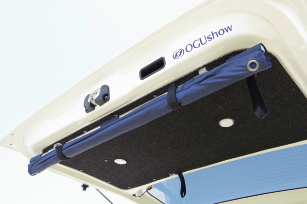 タープを使用しない時はESリアパイプラックに止めてコンパクト収納できます。バックドアに収納しておけるため邪魔になりません。