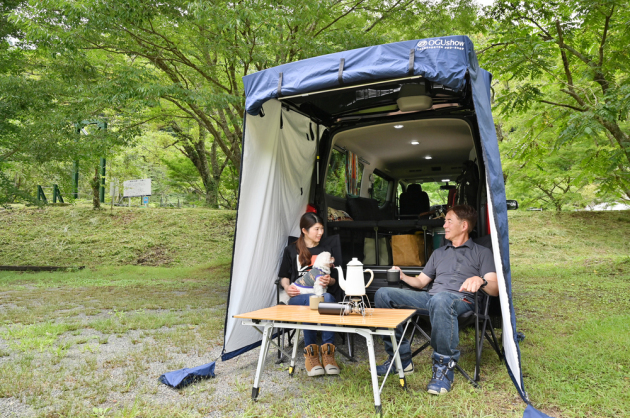 車に取り付けるだけでテントの役割をしてくれるESバックドアテントとESバックドアタープ。
