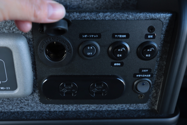 ワンちゃん3匹とお出かけできるようにカスタムしたこちらのキャラバンには、ベッドボックスにバッテリーを収納し、コントローラーなどをセンターコンソールに取り付けました。