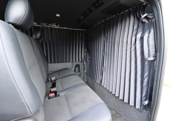 車内にはフロントシートすぐ後ろに設置するSHセンターカーテンと荷室窓とバックドアに設置するSHカーテンを施工しました。