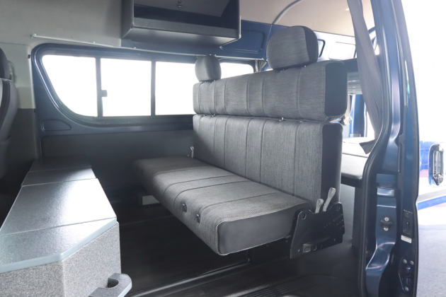 オグショー製の2段ベッドが設置されているこちらのハイエース。ベッド・シートは新しい生地に張り替えられていて大人数で車中泊をしていただけます。