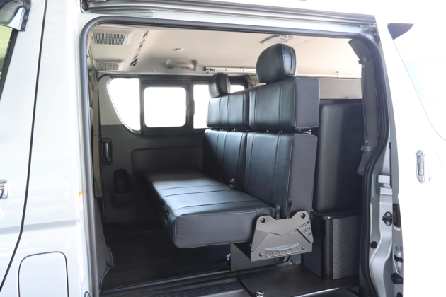 セカンドシートには純正シートからSTシートへ交換。2:1で背座が分割されているので別々でのリクライニングが可能です。前向き・後ろ向き・ベッドと用途に合わせて簡単に展開できるシートとなっています。