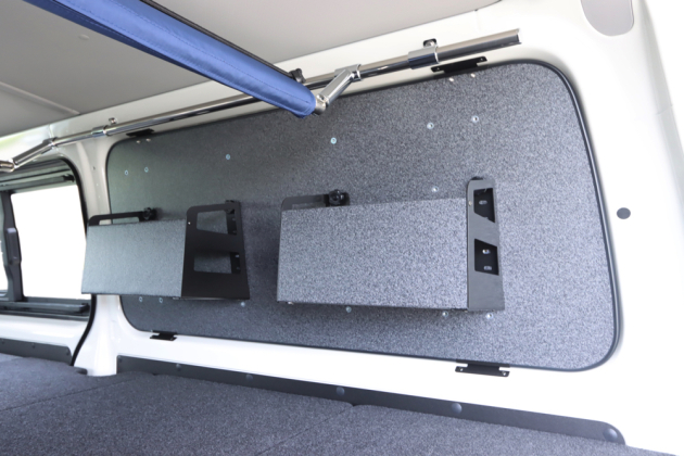 荷室には仕事道具を積載する棚としてユーアイビーグル製の「マルチウェイバリューベッドキット」を設置しました。低価格ながらも強度を備えた高パフォーマンスベッドキットになります。