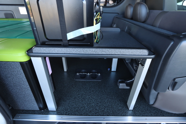 セカンドシートを跳ね上げて、荷室ギリギリまでキャンプ道具やクーラーボックスなどを積載していただけます。今回は特注棚を設置するため、オーバーステップで施工しました。