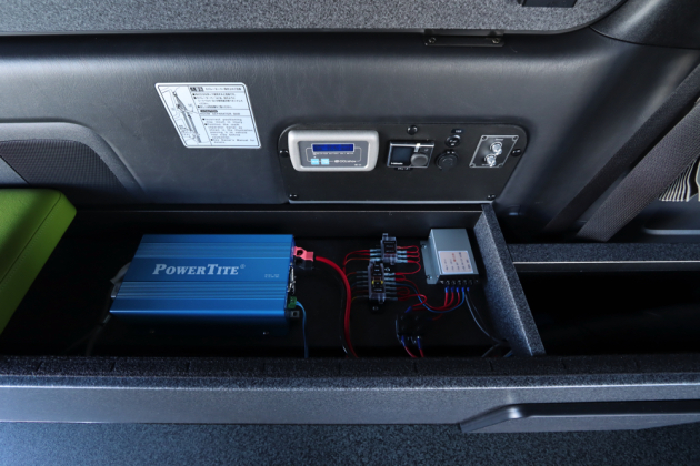 また助手席側ベッドBOXにはサブバッテリーシステムを搭載、バッテリーの点検や不具合があった場合すぐ修理できるようにBOXを加工して配置しています。
