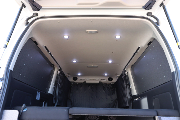 また今回こちらのハイエースに増設したライトには調光機能を搭載しました!フロント側2個と後ろ側4個でそれぞれお好みの明るさに調節が可能です。ベッドで寛ぐ時は後4個だけ点灯したり、セカンドシートで休憩する際は前2個だけ少し点灯させて読書灯として活用していただけます。