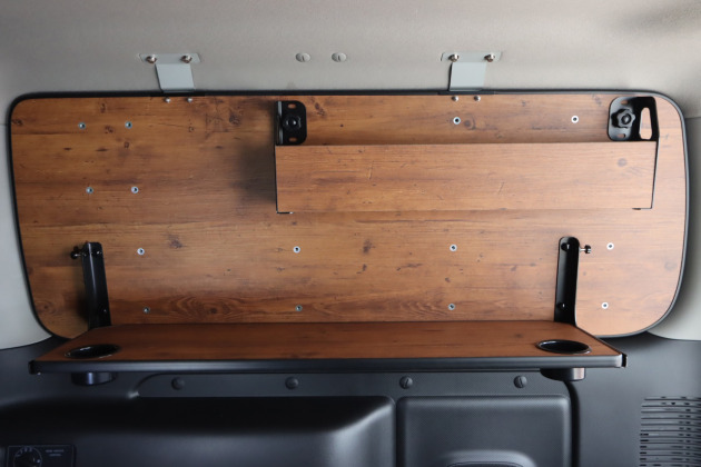 運転席側のリアウィンドウにはES TX ウィンドウパネルを装着し、ES TXテーブルとES TXケミカルトレーをカスタムしました。窓スペースを有効活用して食事ができるテーブルや、小物が収納できる収納スペースができあがります。