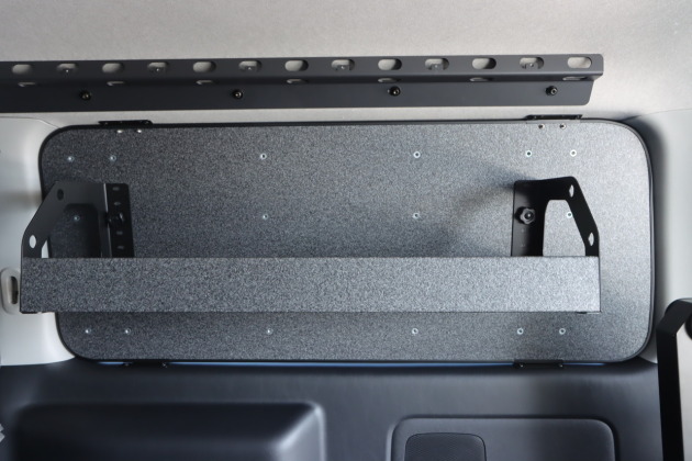 運転席側のリアウィンドウにはESウィンドウパネルとESヘルメットトレーを取付けました!窓スペースに愛用のヘルメットや小物類が積載可能。ウィンドウパネルのナット穴を活用してボルトで固定しているので、簡単に着脱できます。