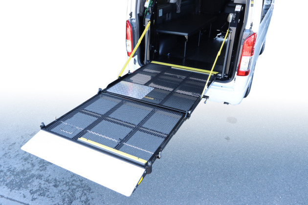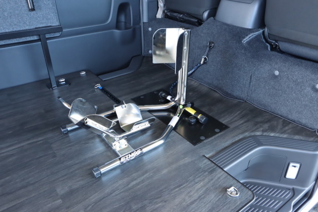 バイクを安心・安全に積載するため、バックドア部分には和光工業製の電動リフトを搭載。リモコンで昇降ができ、最大350kgまで積載可能なので、重量のあるオンロードバイクも問題ありません。