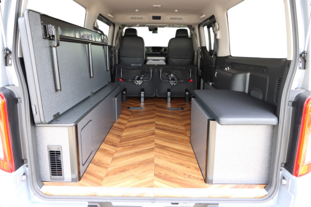 車中泊用ベッドは特注設計したSHシングルフリップベッドになります。運転席側は跳ね上げ式で、助手席側は4分割のベッドマットで構成、積載する荷物や就寝する人数に合わせてアレンジしていただけます。