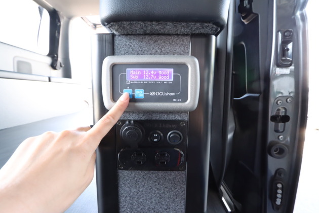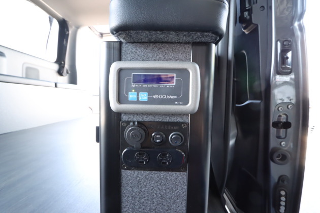 そしてバッテリー関係のコントローラーなどはフロント側のベッドBOX側面へ取付けました。ここからいつでもバッテリーの状態を確認できるので安心です。
