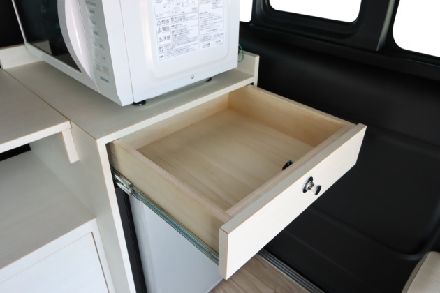 特注の収納棚には、奥のものが取り出しやすい引き出しと、小物類などが収納できる収納BOXも搭載されています。どちらともロック機能が付いているので走行中に飛び出したり、扉が開いてしまう心配はありません。