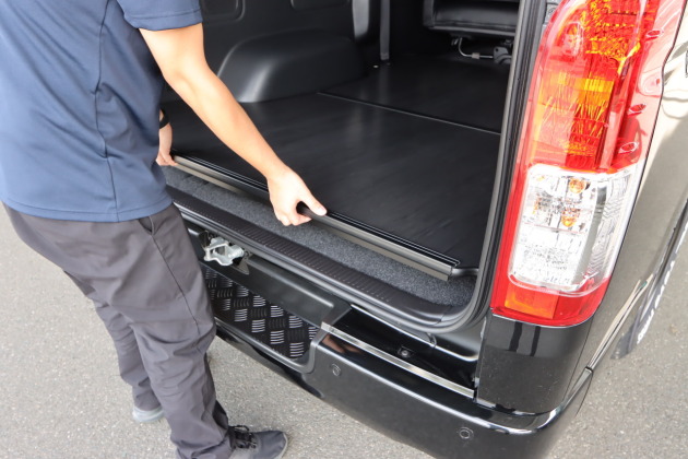 200系ハイエースの荷室にぴったり収まるよう設計されているため、荷室のお手入れがし易く、ベッドの安定感をアップさせる機能パーツとしても欠かせないアイテムです。