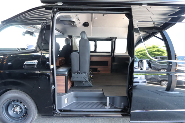 また今回はステップ部分まで床を張りあげるハーフステップ加工を施して、床面積を広げています。ステップ部分が広がることで、サードシートからの乗り降りも楽々です!