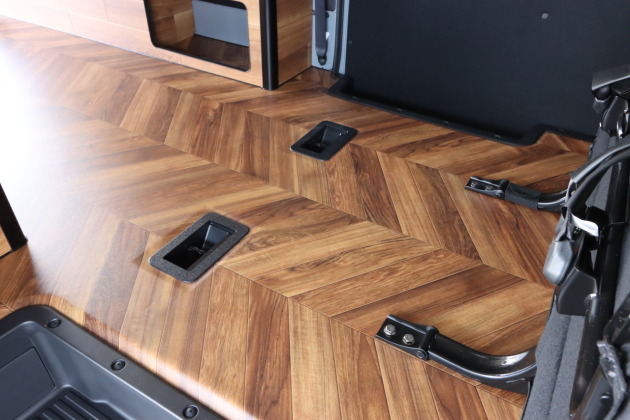 今回オーナー様はチョイスされたのはES TX CONCEPTのフロアパネルにも採用しているherringbone(ヘリンボーン)柄のフロアシート。床一面を明るい木目がV字でデザインされているヘリンボーン柄で貼り上げることでオシャレでアウトドア感のある室内に仕上がります!