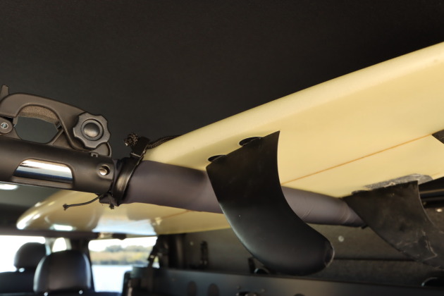 また今まで床に置くしかなかった荷物を天井スペースへ収納することができるので、荷室には釣り道具やクーラーボックスなどなど多くの荷物が積載可能に!ベッドが設置されていても問題ないので釣りの合間や波を待つ時間などはベッドの上で寛ぐことができます。