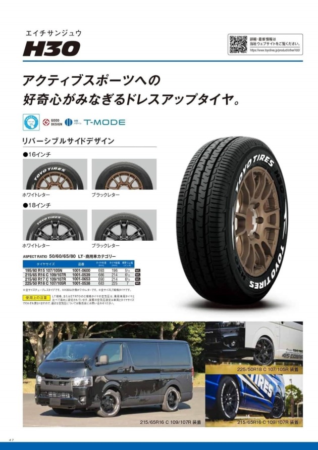 【TOYO TIRES Tire Catalogue 2024】トーヨータイヤ 乗用車・バン・小型トラック&バス タイヤカタログの"H30"ページ(P47)に掲載して頂きました「HIACE OGUshow ES TC CONCEPT」