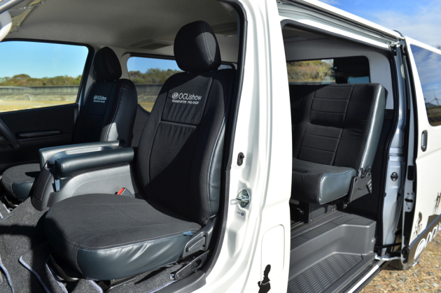 2019に登場したオグショーコンセプトカー「HIACE W PICKUP TRANSPORTER」のデモカーとして使用していた車輌になります。200系ハイエースS-GL標準ボディ標準ルーフをベースに大胆にルーフをカットしたピックアップスタイル。
