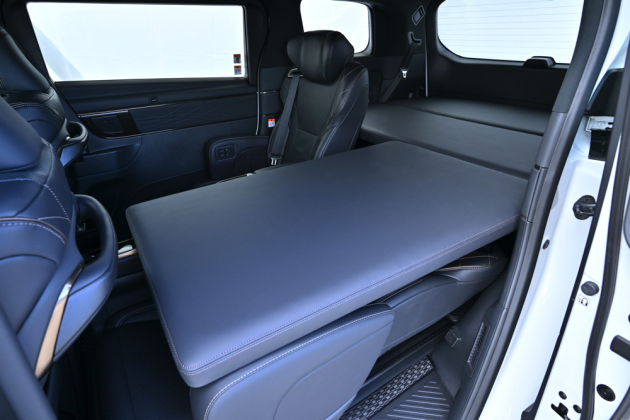 内装レイアウトは純正3rd シートを無くし乗車定員を4名に変更しラゲージペースを確保。そのラゲージスペースの積載容量を可能な限り減らさないように、トリム形状に沿ったベッドフレームを設計。ベッドマットは全長約 2100mm、幅約1400mm のベッド展開を可能にし、マット表皮は“VELLFIRE・ALPHARD”の上質なインテリアに沿った“専用レザー”を“ダブルステッチ”で仕上げています。