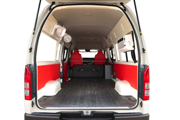 お客さまからお預かりしたワンちゃんや、生徒さんのペットの送迎などでハイエースを使用されているルネサンス・ペット・アカデミー様。室内の温度緩和対策としてクールスターのエアコンや、サーキュレータ、サブバッテリーなどが搭載された車両となります!会場では浜松校のお車を展示予定です。