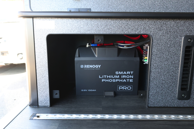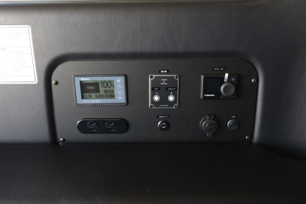 助手席側のベッドボックス内にはSHサブバッテリーを搭載し、内張側面にバッテリーコントローラーやコンセントをカスタムしました。サブバッテリーがあることで、車中泊キャンプや休憩中など車のエンジンを切った状態でも、家電製品の使用が可能。メインバッテリーを気にせず、ヒーターやLEDライトなどが使えるので、快適に室内で過ごしていただけます!