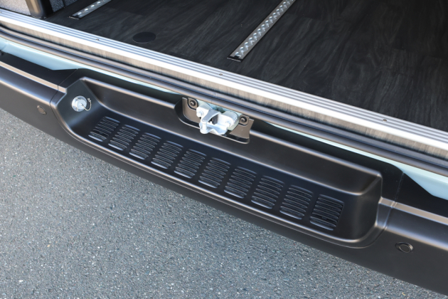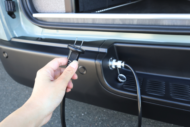 サブバッテリーシステムと一緒にSH外部電源システムもカスタムしました!電源サイトがあるキャンプ場やRVパークで電気の供給が行えたり、自宅でサブバッテリーの充電を行うことができます。今回はリアステップ部分に外部電源システムのコード差し込み口を設定しているので、使用しない時は邪魔にならず外観の見た目も損ないません。
