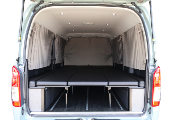 夫婦2人やワンちゃんと一緒に車中泊できるように、ベッドはSHダブルフリップベッドをチョイス。左右がフリップベッドとなっていて、全面展開・左右ベッド展開・片側ベッド展開・ベッド収納と様々なベッド展開ができるので、就寝人数、使用用途に合わせてカスタムしていただけます!