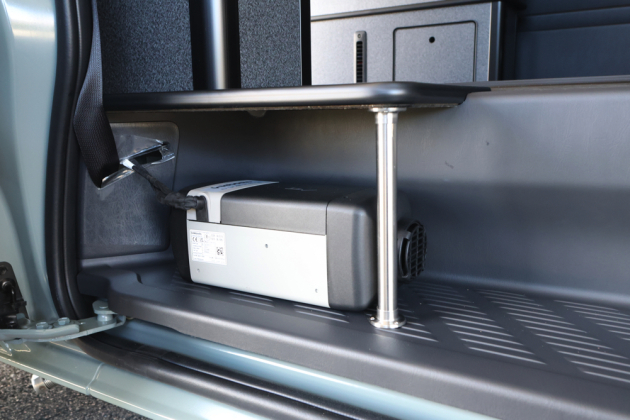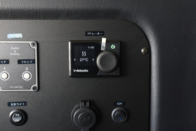 運転席側のステップ床下部分にはFFヒーターを取付ました。冷え込む時期でもこの1台があれば車内を十分に温めてくれるため、毛布などをたくさんもちこんだり、車内で着込む必要はありません。コントローラーから温度や風量を調整できるので、季節や時間帯に合わせて室内の空調管理が可能です!