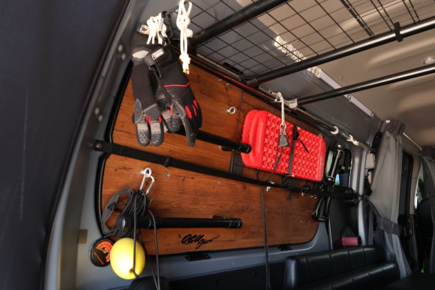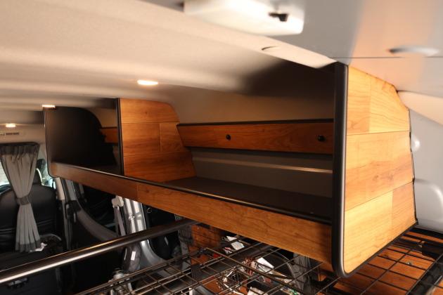 サイドトレーはハイルーフ車に取付けることができる施工となっていて、今回は運転席側天井にトレー2つ連結させてカスタム!デッドスペースになってしまう天井部分にトレーがあることで、寝袋や着替えタオルなどなど、ベッド上に置いたままになりがちな収納したいけどすぐ手に取りたい荷物をまとめてしまっておくことができます!