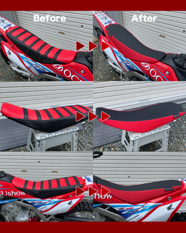 オグショー縫製部門にて、スタッフが所有するホンダCRF125Fのシート張り替えを行いました。へたっていたシートが、生地もカラーも新しく生まれ変わり、見た目も座り心地も大幅にアップグレード!