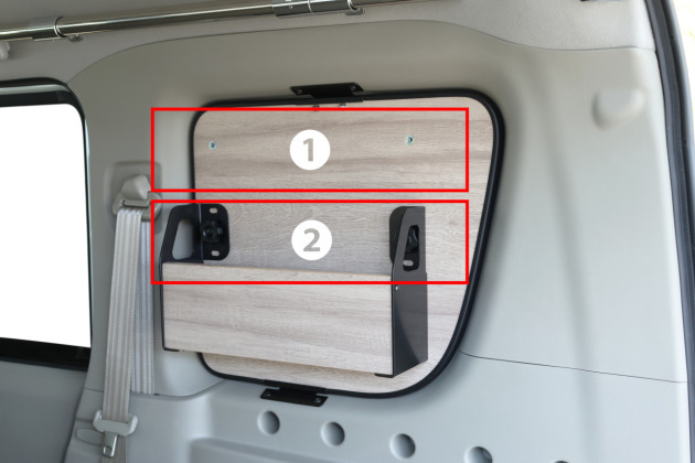 (注)2番の位置にトレーがあるとセカンドシート展開時にシートと干渉してしまうため、シート展開を行う際は1番の位置に取付けてください。