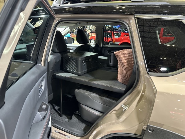 実際にアウトドアグッズを積載したり、外装カスタムでタフギア感が強まったエクストレイルがブース内で目を引いていました。