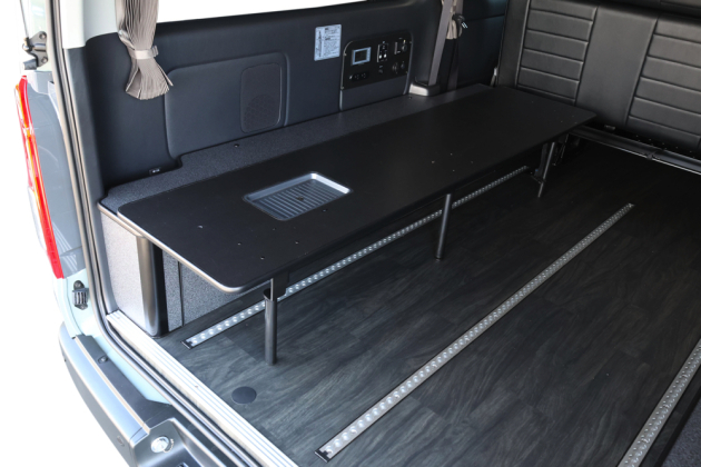 今回はできるだけ普段使いの際邪魔にならないよう、荷室にカスタムしたSHダブルフリップベッドの助手席側のフリップベッドへギャレー設備を搭載。