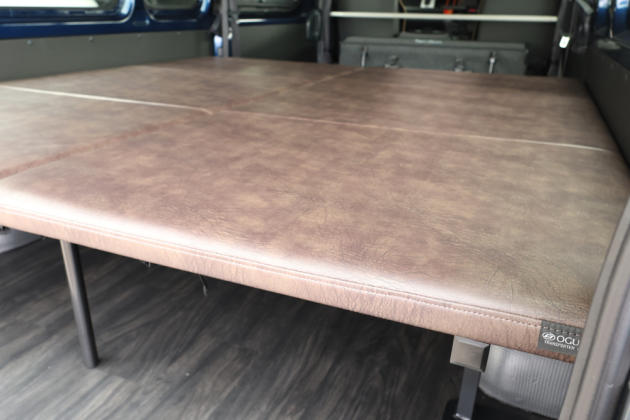 車中泊仕様のベッドには、ESフリップベッドを採用しました。跳ね上げ式の構造で、全面展開・片側展開・収納状態の3パターンへ切り替えが可能なため、用途や就寝人数に合わせて柔軟にアレンジできます。