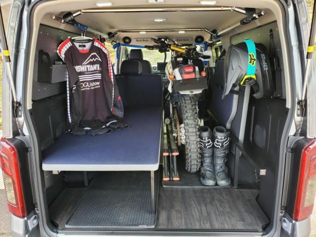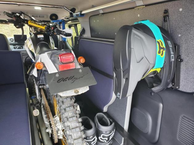 そして会場オグショーブースにて展示しているキャラバンは釣り仕様にカスタムしていた「Angler's Haven Unlimited」ですが、今回はトライルということで室内のESパーツをバイク仕様にチェンジ!