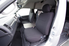 200系ハイエースフロントシートには、純正のシートにESシートカバーを装着しています。モケット状の生地は落ち着きがあり少し高級感のある見た目に変わっています。 フロントシートの真ん中には、樹脂で作ら