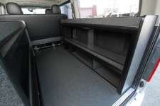 200系ハイエース特装車スーパーロングワイドボディハイルーフ:仕事仕様 セカンドシート横に備えられたボックスは、フルオーダーで製作した小物を収納になっています。 このボックスの収納スペースには、落とし
