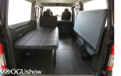 新型キャラバンNV350スーパーロングワイドボディ専用 ■ESフリップベッド ワイドボディ用ESフリップベッドが完成! 片側跳ね上げタイプとしてお使いいただけます。 全面ベッドへの展開も女性でも簡単に