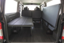 NV350キャラバンのプレミアムGXとバンDXに取付けできる、左右に分割されたベッドです。セカンドシート後ろからリアゲートまでの全面をベッドとして利用でき、大人2人が足を伸ばして寛いでいただけます。