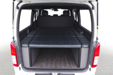 車中泊など休憩時に全面ベッドとして使用し、ゆったり寛ぐことができます。 ボックス部分にも収納が可能なため、収納上手に。 ベッドを使用しない時は、マットをサイドボックスの上に立てかけて留めておけますの
