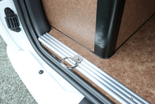 200系ハイエースS-GLボディに施工させていただいた、SH床貼り加工。床の最端部にESフックを取り付けています。 この場所には、屋外にいる際にワンちゃんのリードから手を離さないといけないシーンにリ