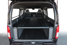今回施工したトランスポーターのベッドにはSHフラットベッドボックスタイプを採用しました。 こちらのフラットベッドはS-GL純正シートをベッド展開した高さと合うように加工しているので 広い寝室空間がう