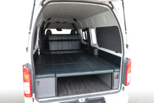 サーキット場で車中泊ができるように、こちらのハイエースにはオーダー制作のSHフラットベッド(BOXタイプ)を設置! SHフラットベッドは両サイドに設置しているBOXへベッドマットを載せることで展開が