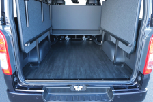 ハイエースのフロアにSH床貼り加工を施しました! 200系ハイエースは、両側スライドドアになっています。 スライドドアから乗り降りが行いやすいようにステップが作られており、スムーズに乗車できます。