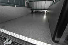 車内をフラットにしているのは、SH床貼り加工(SHフロアレール埋め込み)です。 この床貼り加工をすることで、車内のデコボコが無くなるだけではなく床に柄や色が付きます。今回施工した床は標準設定色の黒木