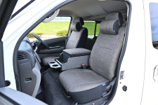 ※セカンドシートで使用しているMOBILITY(移動式)テーブルは開発中です。 日産 NV350キャラバンプレミアムGX用のESシートカバーに、オグショーESモビリティコンセプト専用カラー「クリーナ