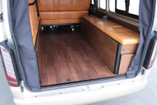 オーナー様のオーダーを受けてリフォームしたこちらの車中泊用ハイエース。 床にも車中泊を快適にする様々なカスタムが施されています! 張り上げた床板はオーナー様が選ばれた柄になります。 車内の雰囲気に合